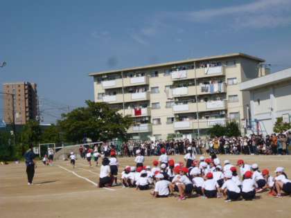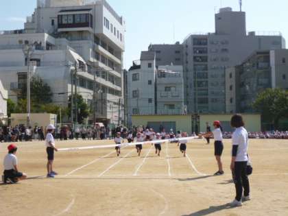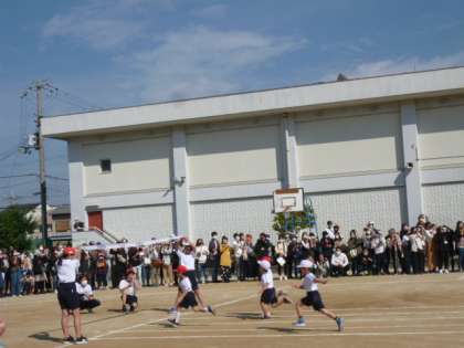 1年生の初めてのかけっこを、6年生が、ゴール係でも実況係でもサポートし、盛り上げます。
