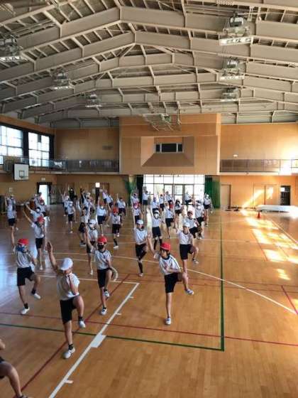 6年生1組と2組で体幹を鍛える運動を行いました。リズムに乗って運動を行うので、楽しく取り組むことができました。