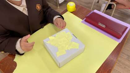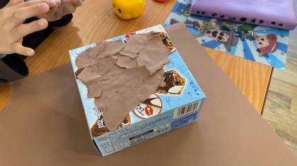 細かくちぎり、箱の柄が見えなくなるよう、丁寧に貼る事ができています♪