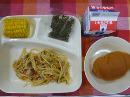 スパゲッティのきのこは、しめじとしいたけの2種類が使われています。しょうゆ味できざみのりをふりかけ、和風の味わいでした。