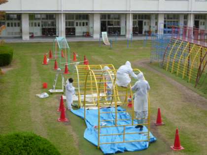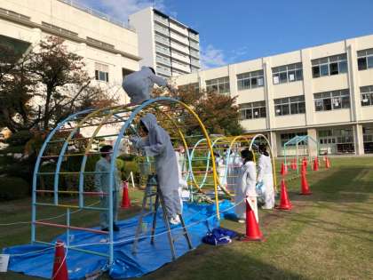 新東淀中学校2年生の職場体験2日目は、ペンキで遊具を塗り替えてくれました。