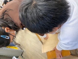 2人一組になって、切る人・持って支えてあげる人に分かれて作業しています。