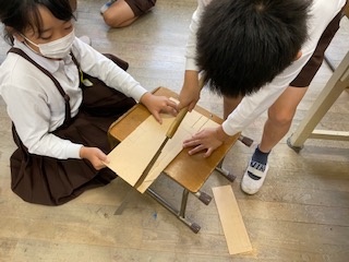 図画工作科の時間にのこぎりを使って、板を切っています。
