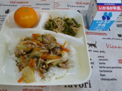 中華丼は、豚肉や具だくさんの野菜、そしてシイタケのもどし汁から味がしっかりと出ています。とろみのきいた餡かけとごはんとの相性もバッチリです。