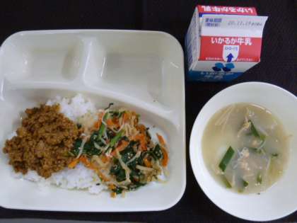 献立のねらいは、「栄養を考えて野菜を多く使い、見た目でも食欲がわくように、みんんが好きなカレーを、韓国・朝鮮料理と少しアレンジして『ドライカレービビンバ』を考えました。また、いろいろな国の食について考えるきっかけとなってほしいです。」とのことです。