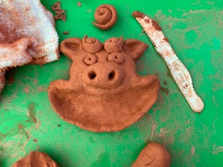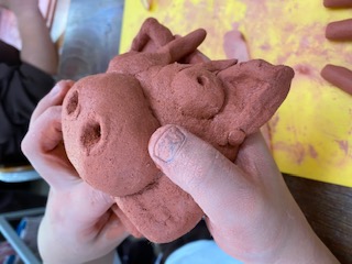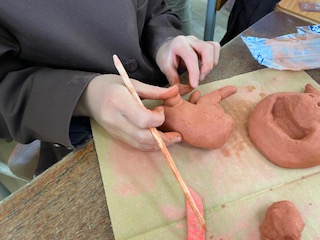 そして、両親指を粘土に付け、押すようにして口を作っていきます。横にも広げていきます。次に、牙や舌を付けていきます。