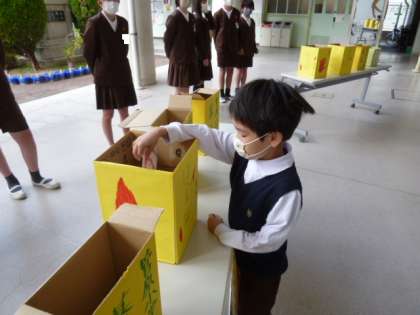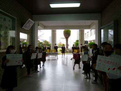 例年は、子どもたちが首から募金箱をさげて募金を受け付けていますが、今年度は密接を避けるため、テーブルに募金箱を置き、ディスタンスをとって活動しています。