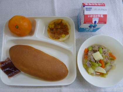 変わりピザは、ピザ生地に餃子の皮を用いています。ツナ・コーン・ピーマン・ピザソース・細切りチーズをのせ、焼き物機で焼いています。生地の周囲の部分はカリッと、中のほうはしっとりと焼き上がり、子どもたちの大好きな味付けです。家庭でもオーブントースターなどで簡単に作ることができそうです。