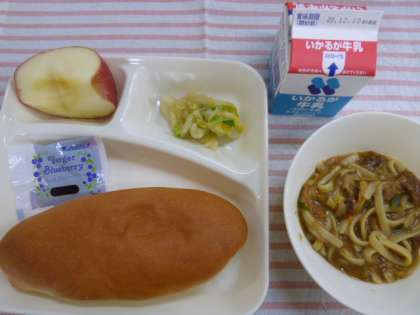 カレーうどんは、昆布とかつお節のだしがきいた和風の味付けです。体があたたまり、冬場にはありがたい献立です。