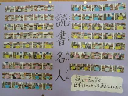 読書週間に実施した読書マラソンを完走した子どもたちが、「読書名人」として表彰されました。なんと79名の名人が誕生!