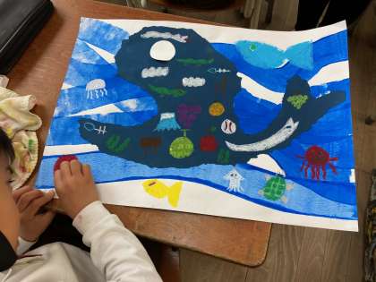 ローラーを使って海の背景を描き、その上に手でちぎって作ったくじらを貼りました。写真は、背景やくじらにクレパスで絵を描いているところです。