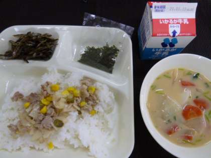 今日は、正月の行事献立で、「ぞう煮」と「ごまめ」が登場しました。れんこんも、先が良く見通せるようにという縁起ものです。