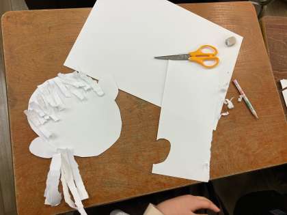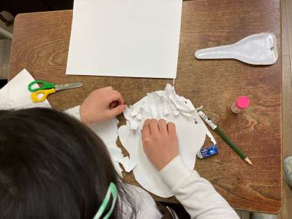図画工作科の紙版画では、「シャボン玉をふくぼく・わたし」を作っています。1年生で自分の顔を作ったので、体と手も作ってシャボン玉を吹いている様子を作ります。顔やパーツははさみを使って、髪の毛は手でちぎって動きが出るように作っています。出来上がりが楽しみですね。