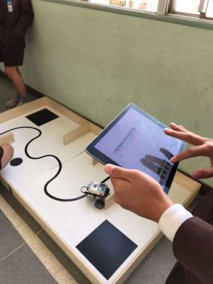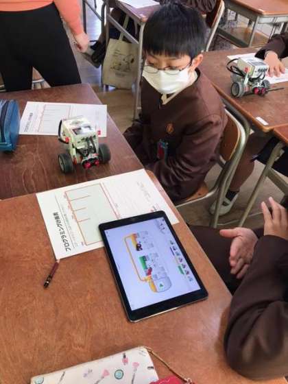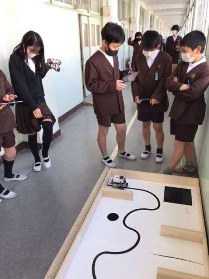 12月に講師の方に来ていただき、プログラミング学習をしました。タブレットを使いながらロボットに指令を出し、動かしました。