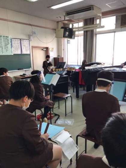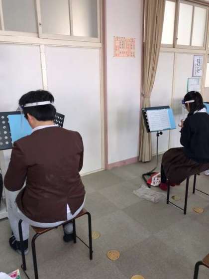 音楽の授業風景です。一人ひとり充分に距離を取って授業を実施しています。