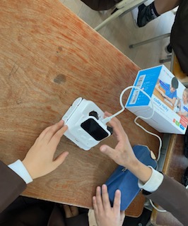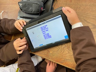 総合的な学習の時間に、プログラミング学習の一環として、タブレットを使い「コーディー」というロボットを動かしました。