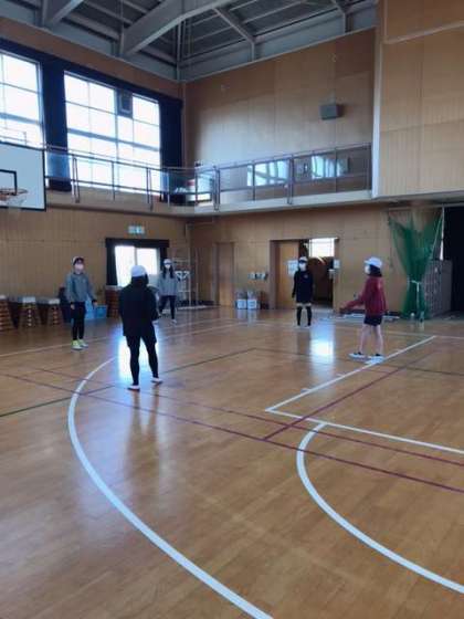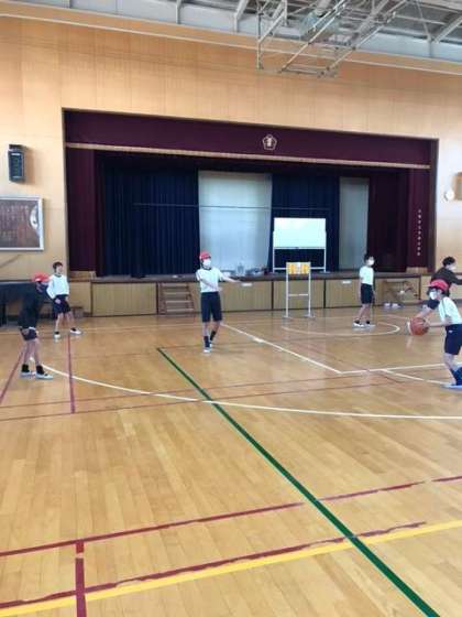 講堂では、バスケットボールをしています。パスやドリブルなどの基礎から、ボールを持っていないときの動き方などの応用まで、チームで練習をしています。
