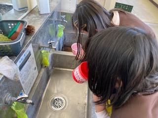 休み時間終了後の手洗いタイム、給食の前後に、ガラガラうがいやブクブクうがい、手洗いをしています。手洗い・うがい強調週間は終了しましたが、引き続き声掛けを行っていきます。ウイルスに負けないようにしよう!