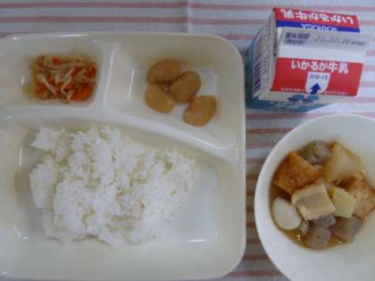 関東煮は「おでん」のことです。うずら卵にアレルギーのある児童の分は、除去食として別に取り分けて調理しています。