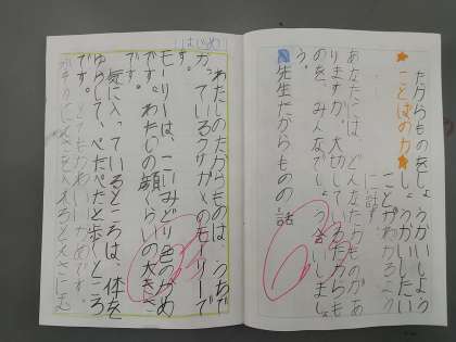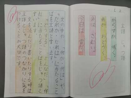 来週にあるまとめテスト週間に向けて、自主的に勉強している子どもたちがいるので、その子たちのノートを紹介したいと思います。今までに学習した国語科の「なかまになることば」や「主語 じゅつ語」などをノートにまとめたり、「たからものをしょうかいしよう」の書き方をノートに写したりしています。