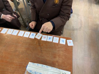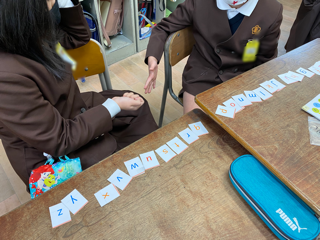 外国語活動では、アルファベットの学習をしています。C‐NETの先生が言ったアルファベットを指さしするポインティングゲームやバラバラにしたアルファベットを「a b c d....」と順番に並べ替えるゲームなどをしました。