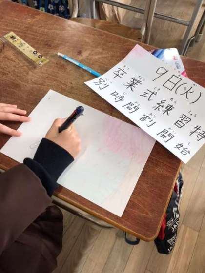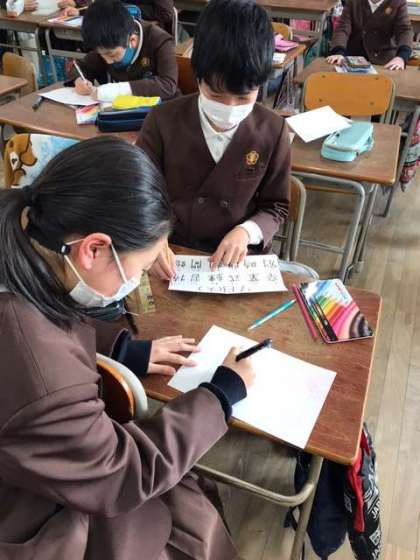 掲示委員会の活動の様子です。職員室前に月の行事予定を貼っています。写真は行事予定を作成している様子です。