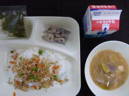 鶏ごぼうご飯は、鶏ひき肉につけたしょうがの下味がよくきいており、ごぼうとつきこんにゃくの食感の取り合わせもよく、刻みのりをふりかけて美味しくいただきました。人参とグリーンピースも加わり、彩り豊かです。