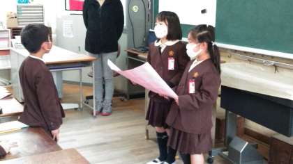 おもちゃまつりのお礼の手紙を書いて、みんなで2年生に届けに行きました。2年生の前で、大きな声で堂々とお礼の言葉が言えましたよ!2年生は、「来年はみなさんが次の1年生のためにおもちゃを作ってください」と言ってくれました。来年が楽しみですね!
