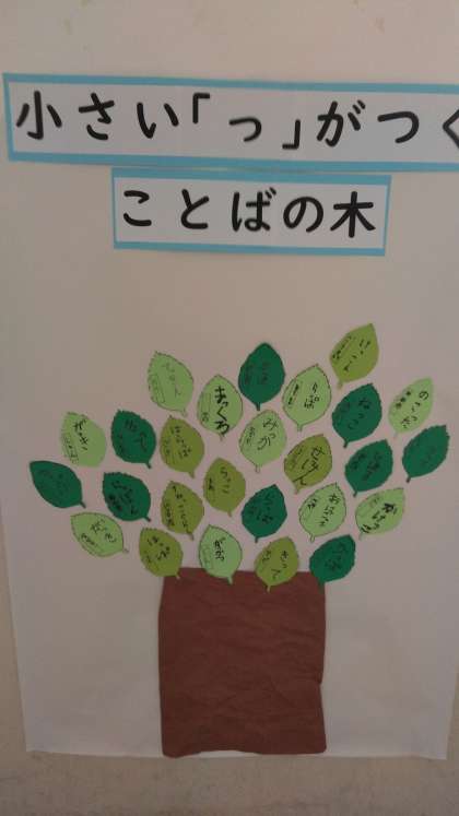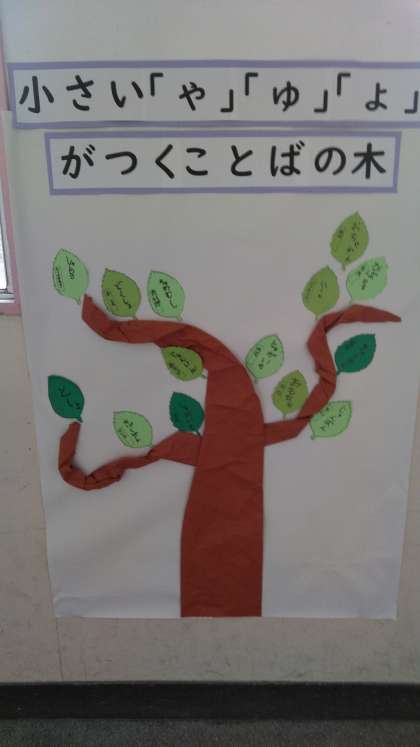 ひまわり学級担当の塗谷先生が、書き間違いの多いひらがなについて、各クラスを回って指導してくださっています。今週は、(1)小さいつのつく言葉 (2)小さいやゆよのつく言葉 (3)伸ばす音がつく言葉 (4)色々混じっている言葉、の4種類の言葉集めをし、葉っぱに書きました。書いた葉っぱは、廊下の木に貼っています。来週からは、言葉を見つけたら、葉っぱに書いて塗谷先生に渡すと貼ってもらえます。たくさん見つけて、木を葉っぱでいっぱいにしましょう!