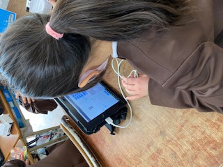 総合の時間に、プログラミング学習の一環で「コーディー」というロボットを動かしました。ペアで試行錯誤して、前回より難しい課題にチャレンジしました。課題というのは、コーディーを三角の形に動くようなプログラミングをしたり、障害物に当たりそうになったら止まったりするという課題です。