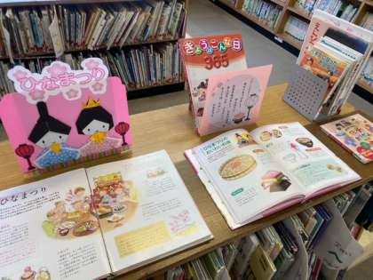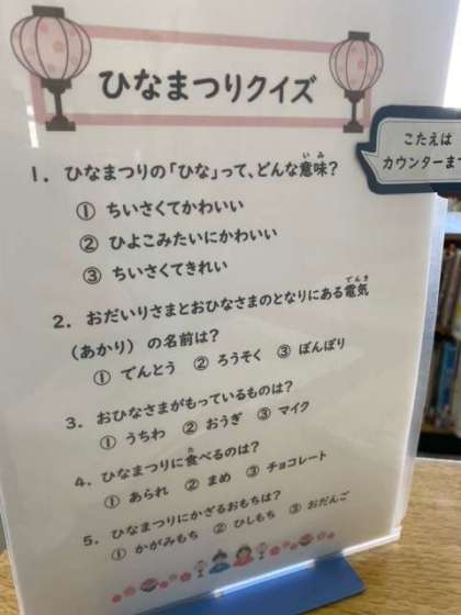ひなまつりクイズも掲示しています。こたえは図書室のカウンターまで!