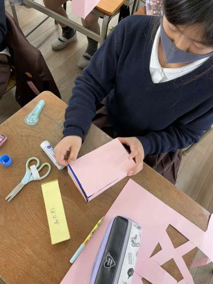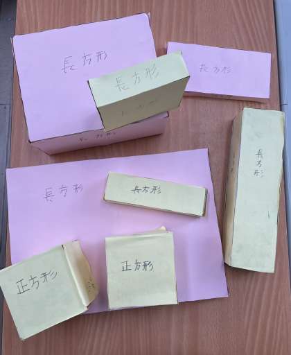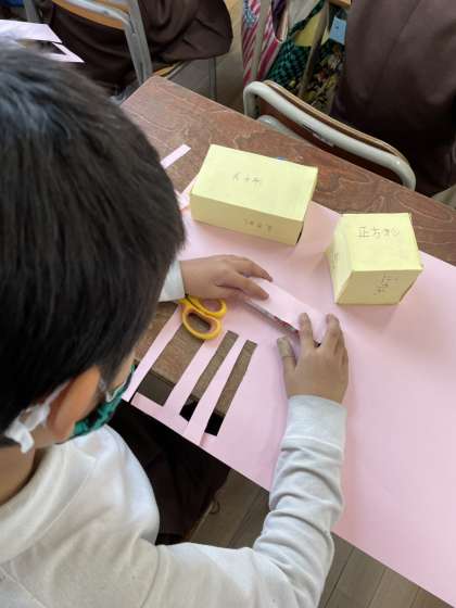 算数科ではこの形の学習をしています。はこの面の形を調べると、2学期に学習した長方形や正方形を発見しました。また、面が6こあることが分かりました。これから、はこをくわしく調べていきましょう。