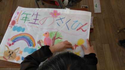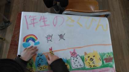 1年間の作品を持ち帰るための作品袋に絵を描きました。みんな、自分の描きたい絵を楽しみながら描いていました。