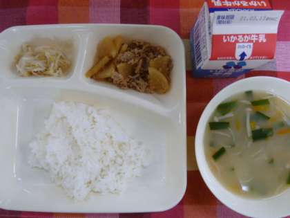 韓国・朝鮮の伝統料理をもとに作られた献立です。コチジャンはトウガラシの入った味噌で、辛みに加えて甘みとコクがあり、ビビンバなど、韓国・朝鮮料理には欠かせない調味料です。今日は、豚肉と大根をニンニクと一緒に炒めたところに、コチジャン・砂糖・しょうゆで味付けされていました。