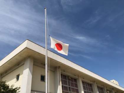 震災で亡くなった方々への哀悼の意を表し、今日は、掲揚台の国旗も、「半旗」としてます。