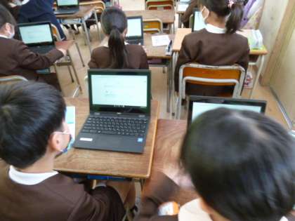 (2枚目)あちらこちらの教室で、導入されたばかりの一人一台端末が大活躍しています。写真は、3年生が学級での年度末アンケートを取っている様子です。リアルタイムで集計されていく画面を見ながら、「『はい』がめっちゃ増えてきた〜!」と大興奮していました。