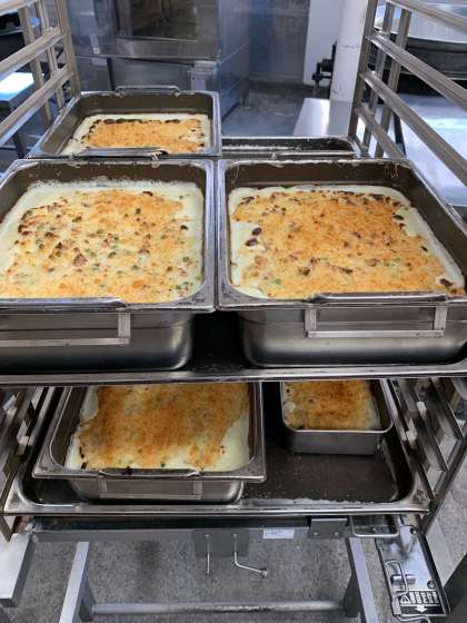 マカロニグラタンは、一度玉ねぎや鶏肉をいためて小麦粉をふるい入れ、牛乳、クリーム、塩、こしょうで味つけした後、焼き物機という大きなオーブンで、焼いています。