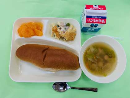 子ども達に人気のメニューで、スープもみかんの缶づめもよく食べていて、調理員さんも喜んでいましたよ。