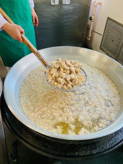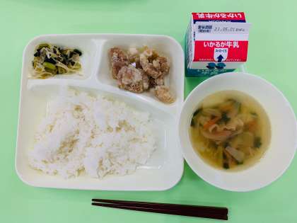 右の写真は、からあげを揚げているところです。今日のからあげは、しょうが汁、にんにく、塩、こしょうで味つけしたもので、子ども達にも大人気でした。