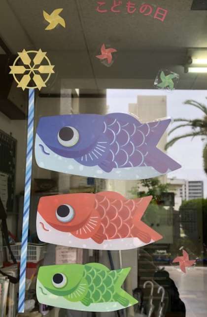 左の写真は、管理作業員室の窓に貼られたこいのぼりです。子どもたちが少しでも明るく楽しい気持ちで登校できるよう、管理作業員さんも工夫してくれています。