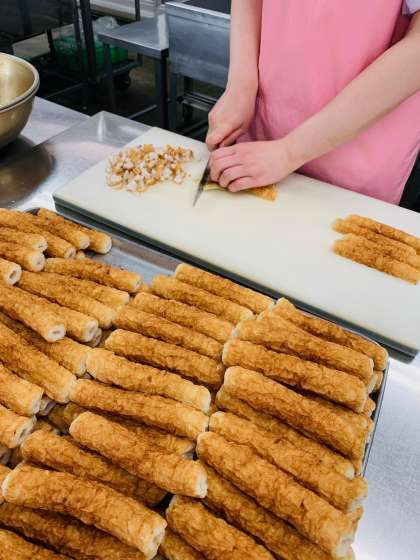 かやくご飯は、鶏肉とちくわ、さんどまめ、にんじんをだしで煮、砂糖、みりん、塩、うすくちしょうゆで味つけしたものです。ご飯の上にのせ、のりをかけて自分で混ぜていただきます。ごはんとよく混ざるように、ちくわも小さく切っています(右写真参照)。