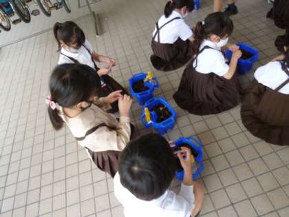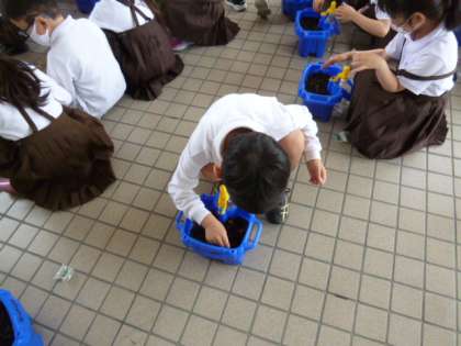 1年生はアサガオの種をまいていました。優しく優しく、赤ちゃんにお布団をかぶせるように・・・。真剣そのものの表情で取り組んでいます。