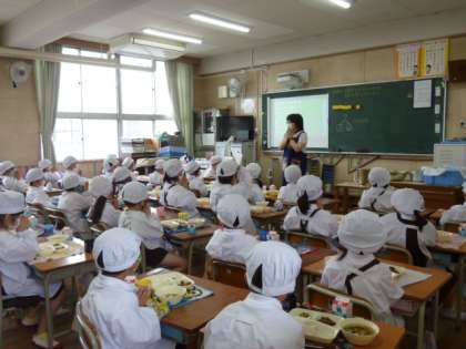 右の写真は、1年生のいただきますの様子です。身だしなみもきちんと整っていますね。「いただきます!!」は心のなかで。静かに給食がスタートします。