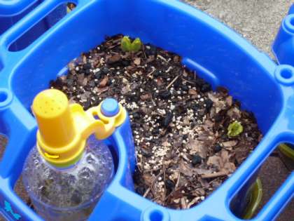 写真中)1年生が「咲いたよ!」と教えてくれました。見ると、先週種まきをしたアサガオの鉢から、小さな小さな芽が顔を出しています。