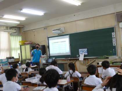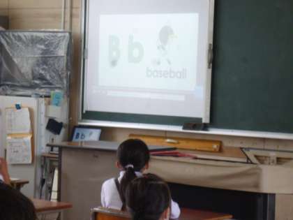 1年生は初めての経験ですが、英語でのアニメーションを見た後、担任の先生の「What did you hear?」の問いかけに、「Lion!」「Good morning!」など、聴きとることのできたことばを発表していました。