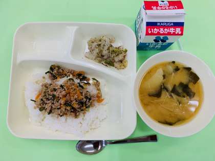 そぼろ丼は、令和元年度学校給食献立コンクールで最優秀賞に選ばれた、大阪市の子どもが考えた献立です。しょうが・にんにくの風味をきかせた、ごはんに合う味つけになっています。