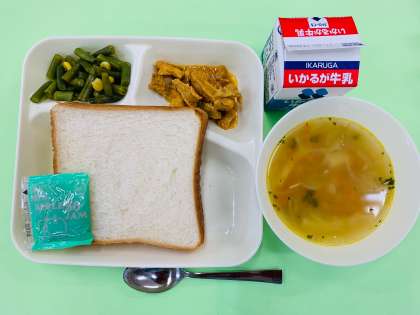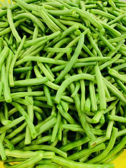 さんどまめは、鹿児島県産の生のものを使用しています。(右写真参照)今が旬の野菜なので、ビタミンたっぷりのきれいな緑色をしています。今日は、コーンとともにゆでて、サラダにしています。