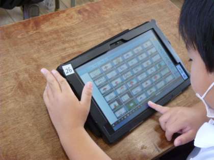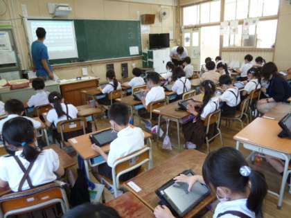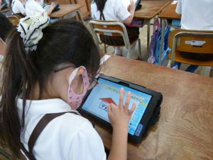 1年生の教室で、ICT教育の研究授業が行われました。SKYMENUの「発表ノート」というアプリを活用したスタートプログラムです。