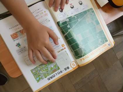 算数科では、今日から新しい単元に入りました。直線と直線が交わっているところに、うすい紙を重ねて、交わり方を調べました。新しく垂直という言葉も覚えました。