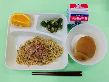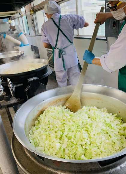 今日の焼きそばは、塩、こしょう、うす口しょうゆ、こい口しょうゆで味つけし、できあがりにかつおぶしをかけたものでした。キャベツを入れるとかさが増えますが(右写真参照)、いためていくとしんなりしていきます。こげないように注意しながら、調理員さんはスパテラという大きなしゃもじのようなもので混ぜます。
